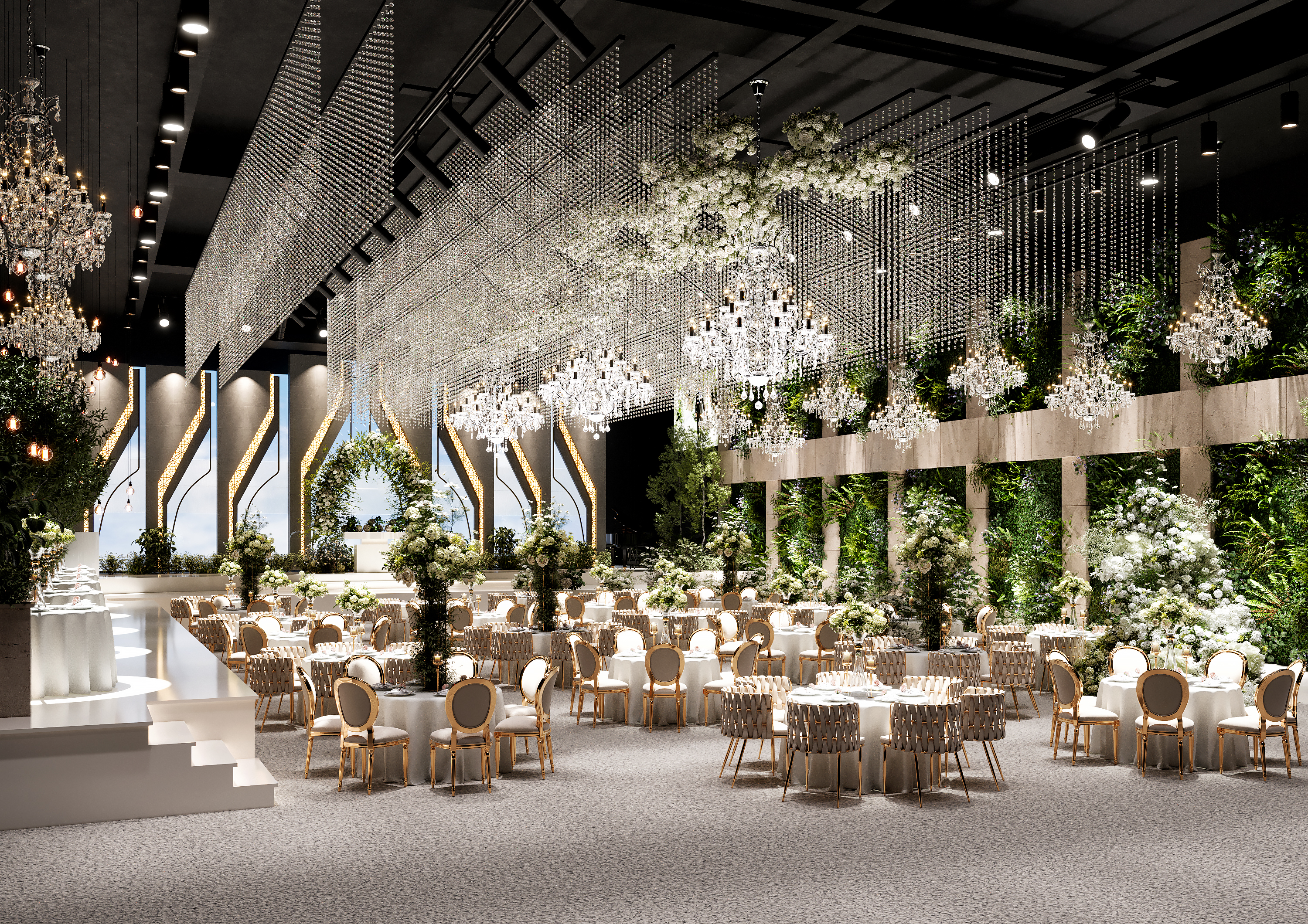 이 모든 홀이 8m 이상의 압도적인 천고를 보유하고 있어, 그 어떤 홀에서도 느낄 수 없었던 웅장하고 품격 있는 분위기와 공간감을 선사합니다. 최신 트렌드를 반영한 디자인, 정교한 음향 시스템, 그리고 드라마틱한 조명 연출은 신랑신부를 영화 속 주인공으로 만들어 줄 것입니다.